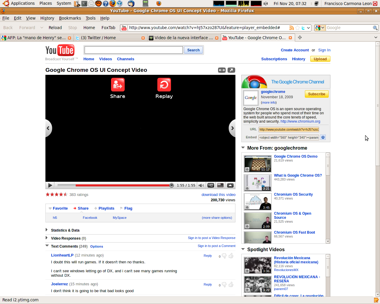 video de google chrome OS Posted on November 20, 2009 by Frank Cisco Minimalista, pero quiere decir que será un S.O. solo “para llevar”? Hay muchas aplicaciones que son utilizadas a diario en laptops y desktops. Share this: Click to share on X (Opens in new window) X Click to share on Facebook (Opens in new window) Facebook Like Loading... Related