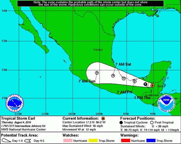 TT Earl velocidad del viento 72kmh y bajando Posted on August 4, 2016 by Frank Cisco Actualmente sigue con categoría de Tormenta en un rato podrá bajar a ser Depresión. Las lluvias aún así serán fuertes pero no torrenciales y el viento será mucho menor.